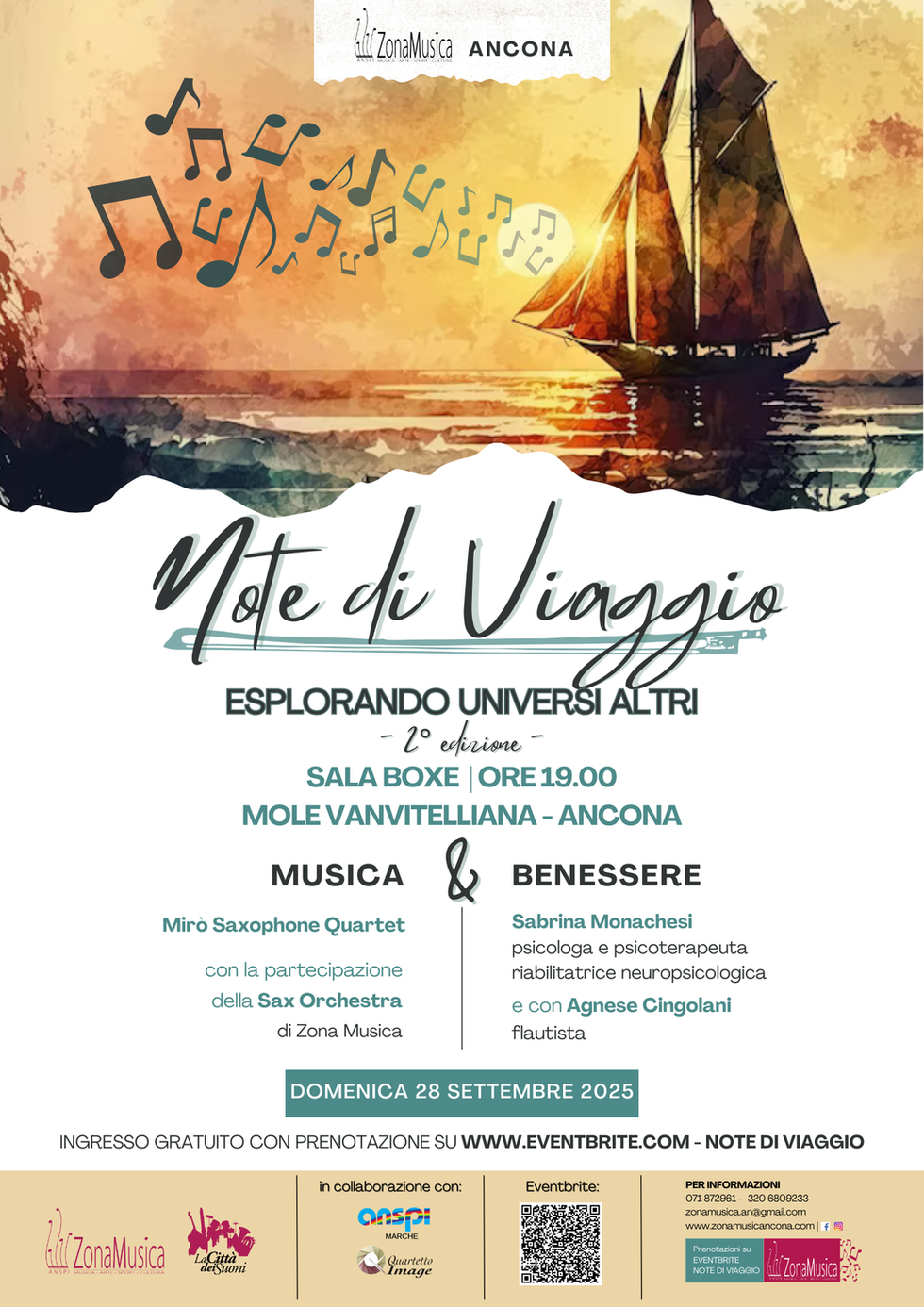 Riparte la rassegna Note di Viaggio di ZonaMusica e ad aprire il calendario 2025 sarà un appuntamento speciale dal titolo Musica & Benessere, in programma il 28 settembre alle ore 19:00 presso la Mole Vanvitelliana – Sala Boxe di Ancona.